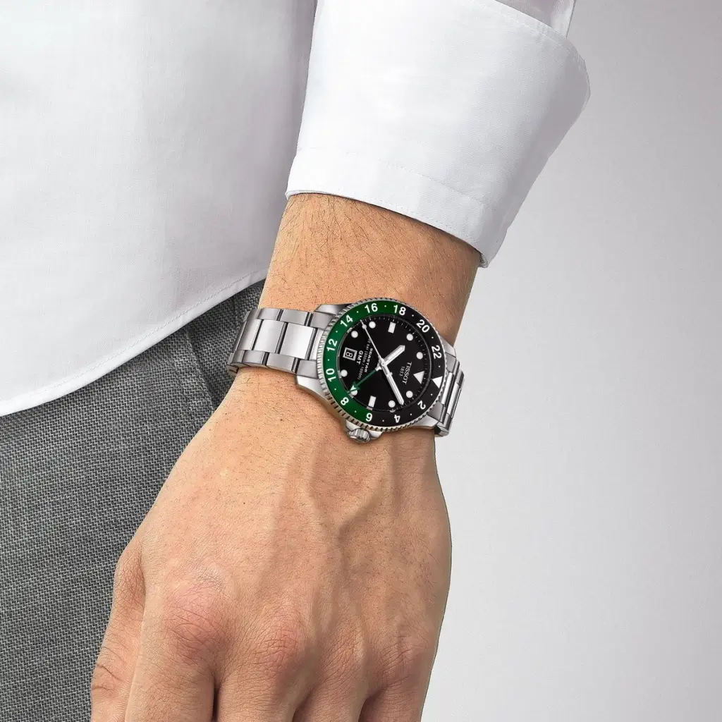 Este modelo combina todos los elementos que esperarías de un reloj deportivo y es un reloj en el que puedes confiar, ya sea dentro, sobre o debajo del agua. Su impresionante resistencia al agua hasta una presión de 30 bares (300 m/1000 pies) se combina con la energía de un movimiento de cuarzo Swiss Made. Con una corona y un fondo de caja atornillados y Superluminova que garantiza su lectura en la oscuridad, el Seastar 1000 Quartz GMT es un as acuático que realmente lo tiene todo. La corona atornillada también ofrece protección adicional contra golpes. COLECCIÓN: T-Sport MODELO: SEASTAR 1000 Quartz GMT REFERENCIA: T120.852.11.051.00 ORIGEN: Hecho en Suiza MOVIMIENTO: Cuarzo suizo. Tipo de batería Renata 371 FUNCIONES: Hora, minutos y segundos. Fecha FORMA DE LA CAJA: Redonda. MATERIAL: Caja de acero inoxidable 316L. ESFERA Y AGUJAS : Negro. Índices y manecillas con superluminova. CRISTAL: Cristal de zafiro resistente a los arañazos. CORONA: Cerrada a rosca. TAPA: Cerrada a rosca. CARACTERÍSTICAS: EOL (indicador de fin de vida útil de la batería), GMT. Anillo bisel mineral. PESO: 148 gramos DIMENSIONES: Ø 40.00 mm por 11.80 mm de espesor. ESTANQUEIDAD: Estanqueidad hasta 30 atm / 300 m (Buceo). BRAZALETE: Correa de acero inoxidable de 20 mm de ancho. Brazalete de liberación rápida intercambiable. HEBILLA: Cierre desplegable con seguridad y pulsadores. GARANTÍA: 2 años Oficial internacional.