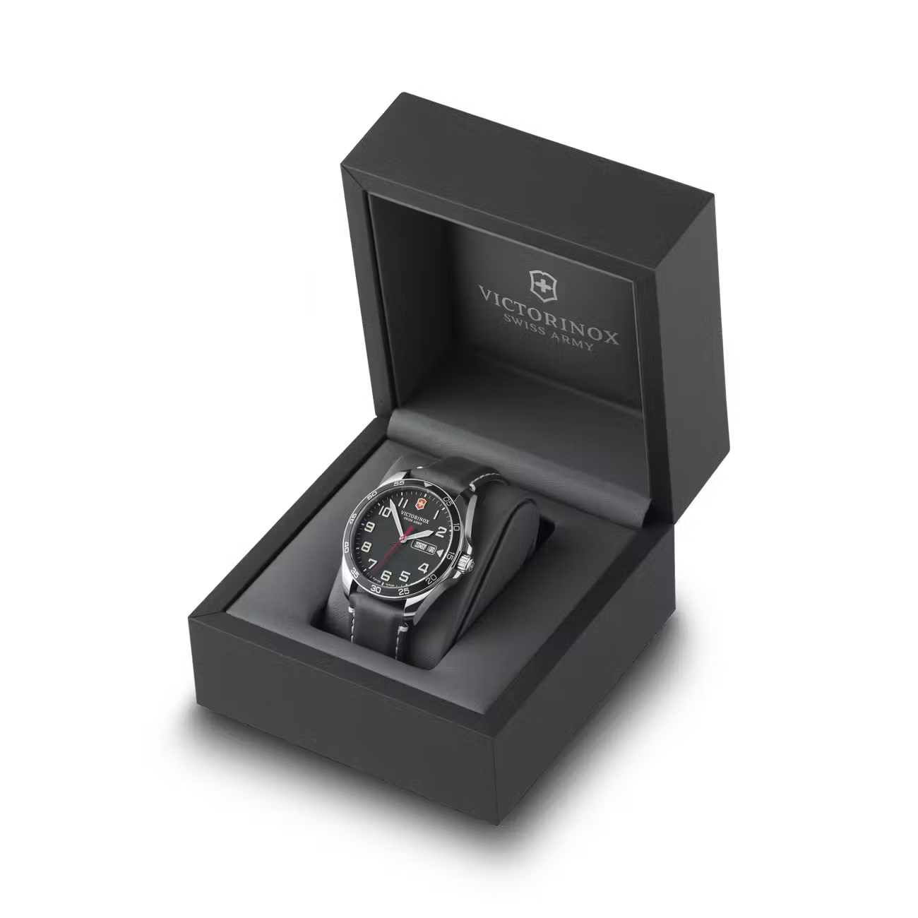 Reloj Victorinox Fieldforce 241846 de movimiento de cuarzo suizo preciso, con caja de acero inoxidable de 42 mm y cristal de zafiro resistente a rayaduras. Presenta esfera negra con números grandes y agujas luminiscentes para facilitar la lectura día y noche, además de indicador de día y fecha. El segundero rojo con contrapeso en forma de navaja suiza le da un toque distintivo. Es resistente al agua hasta 100 m, lo que lo hace apto para natación ligera. La correa típica es de cuero con hebilla estándar.