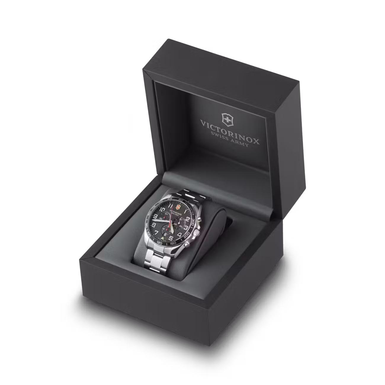 Reloj Victorinox Fieldforce 241855 es un reloj suizo de carácter deportivo y elegante, equipado con movimiento de cuarzo y función cronógrafo. Presenta caja de acero inoxidable, esfera negra de alta legibilidad con tratamiento luminiscente, cristal de zafiro y resistencia al agua de 100 metros, lo que lo convierte en una opción confiable y versátil para el uso diario.