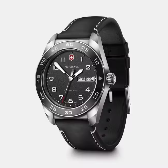 Su caja de acero inoxidable de 42 mm, combinada con un acabado cepillado y bisel pulido, refleja un estilo clásico y robusto. La correa de cuero negro añade comodidad y elegancia, completando un reloj diseñado para quienes exigen rendimiento y estilo en un mismo accesorio.